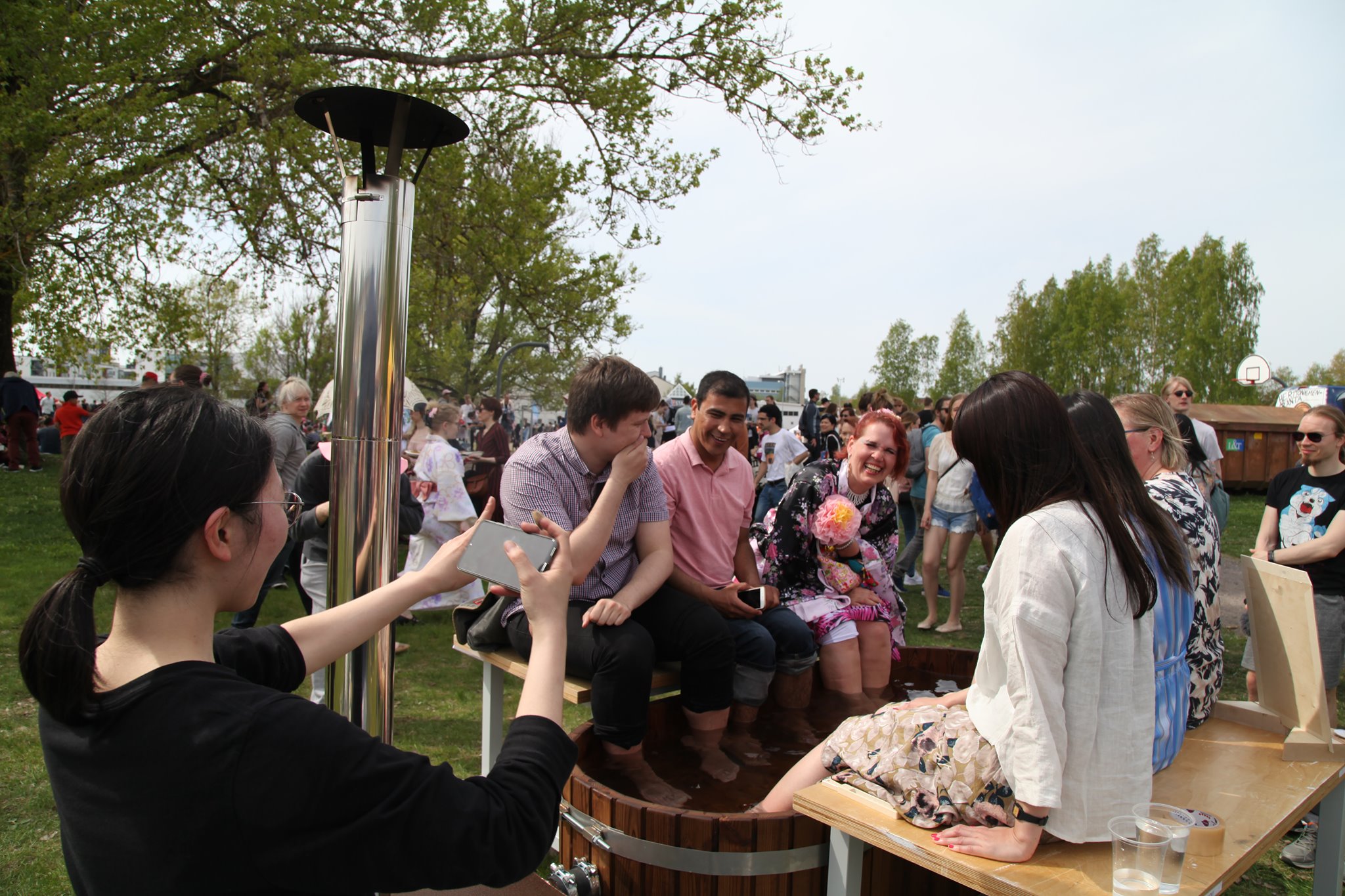 Nippoli took part in the annual Roihuvuori Hanami -event which was held on Sunday the 19th of May 2019. Our association decided to do something different than the usual picnic this year, and therefore we had planned for several months to bring a Japanese Mobile Footbath with us to Hanami -event, built & designed by Aalto University’s Japanese exchange students Mayumi and Yousuke. We also wanted to have our own food stall at the event in which we prepared and sold different small dishes from Japanese cuisine, as we usually do in our sauna events.