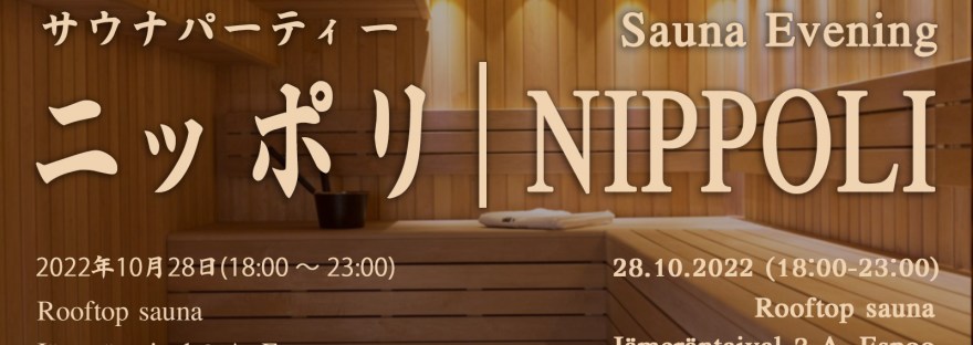 アアルト大学の日本文化サークル、「ニッポリ」のサウナパーティーが2022年10月28日(金)にOtaniemiのRooftop Sauna(Jämeräntaival 3A, エスポー)にて開催です!